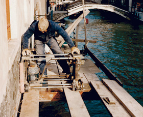 Vengono inserite lastre isolanti in vetroresina sabbiata, in modo da impedire fisicamente Ia risalita dell’acqua. Con una macchina si esegue il taglio nella muratura umida, all’interno della fessura così prodotta s’inseriscono le lastre di materiale impermeabile. Si procede poi al consolidamento delle murature inserendo zeppe d’ancoraggio, quindi iniettando, sino a saturazione, una malta premiscelata ad elevata resistenza e sabbia fine, completa d’additivo antiritiro in modo da non ingenerare crepe successive.